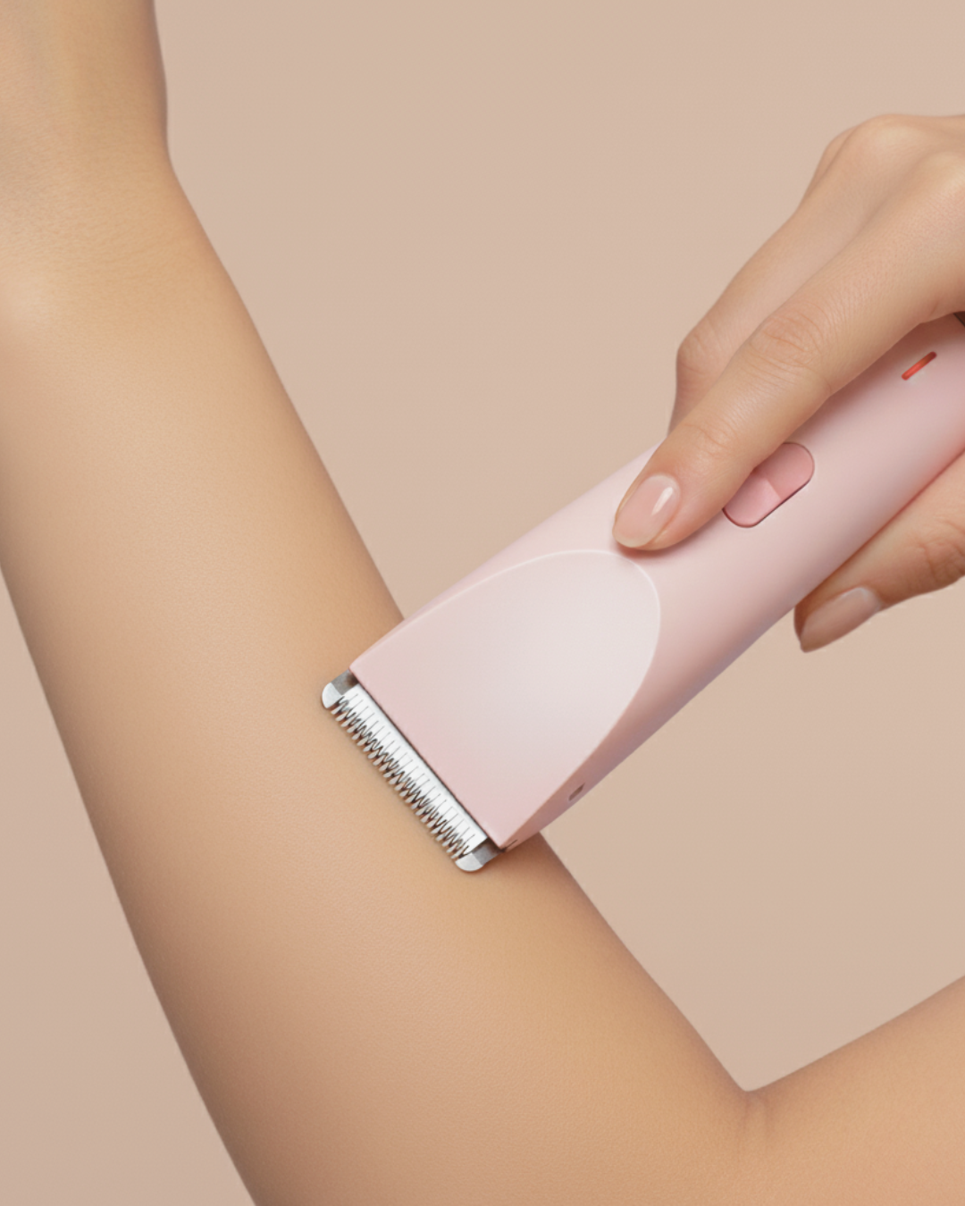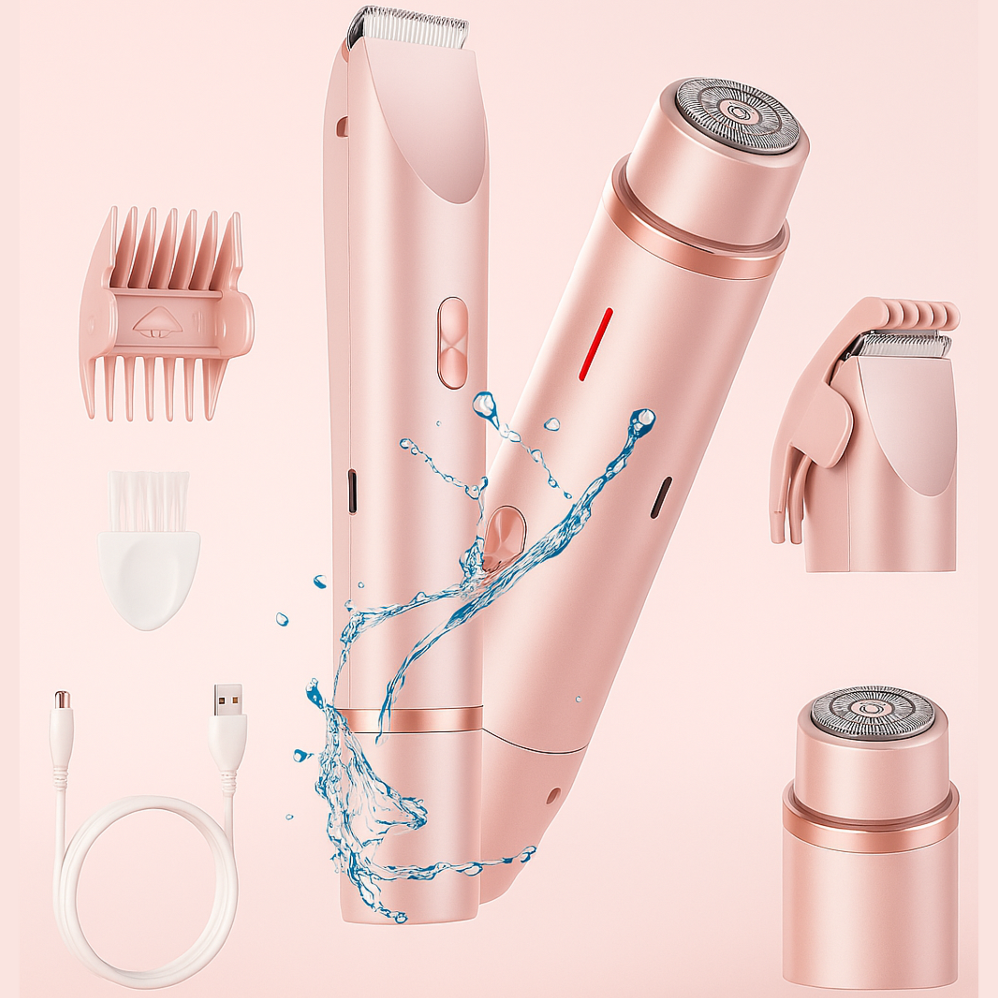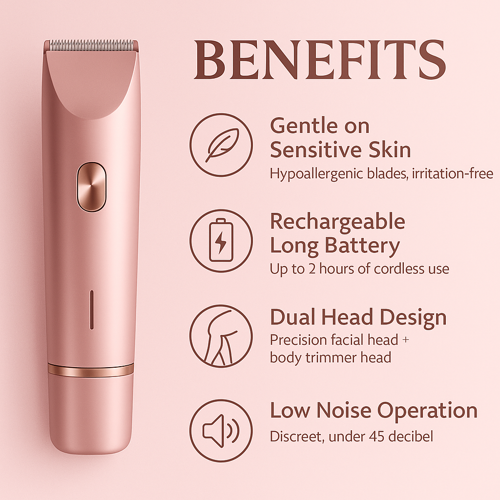 Your essential grooming companion designed for busy women seeking effortless elegance. This innovative trimmer offers dual shaving heads for versatile, pain-free hair removal on both body and face.
